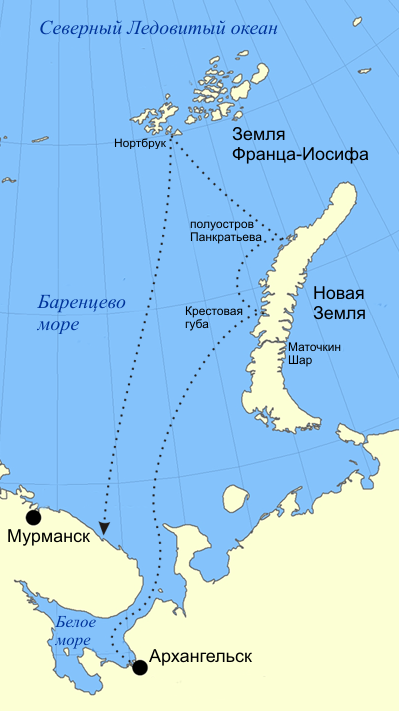 В августе 1912 года команда вышла из архангельского порта. Седов предполагал зазимовать на Земле Франца-Иосифа и оттуда отправиться к полюсу. Но поздний выход позволил добраться только до Новой Земли,