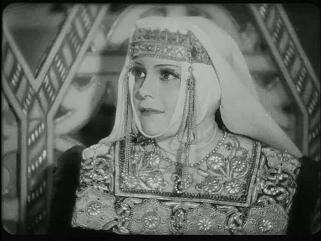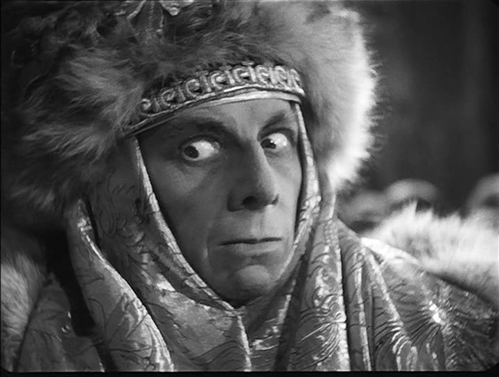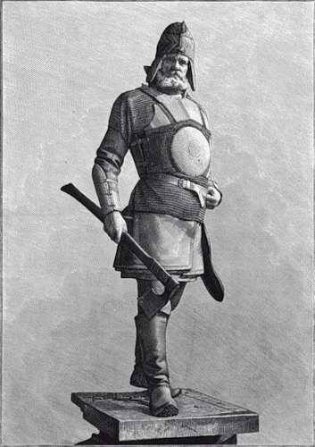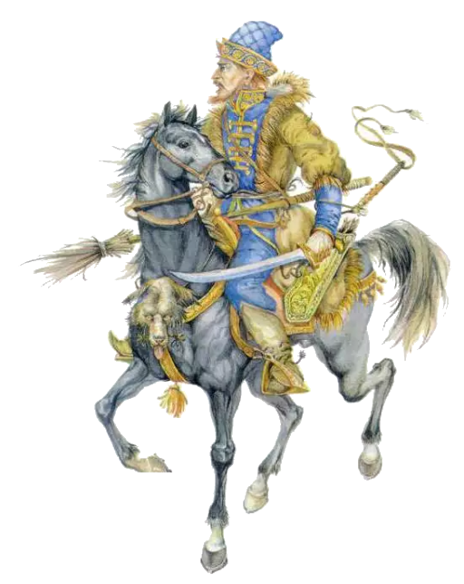 золотистый парчовый наряд с темным восточным орнаментом, инкрустированные сапоги красного бархата и соответствующий головной убор. В одной руке правитель крепко сжимает посох.