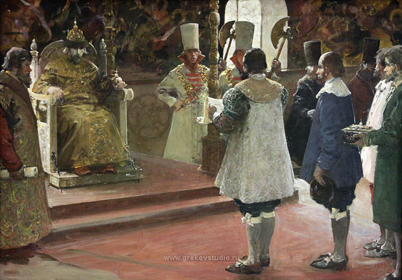 Царь изображен на лестнице в одной из своих палат. На нем – истинно царское одеяние, тщательно выписанное художником в точном соответствии с исторической действительностью: