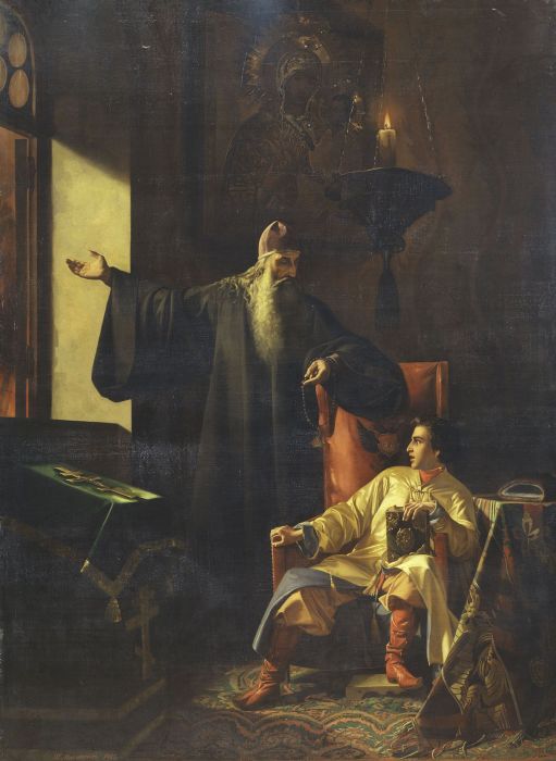 ему же было суждено прервать жизнь наследника престола. Другая же рука перебирает четки – символ глубокой веры и уважения православных традиций. Под ногами Ивана Грозного –